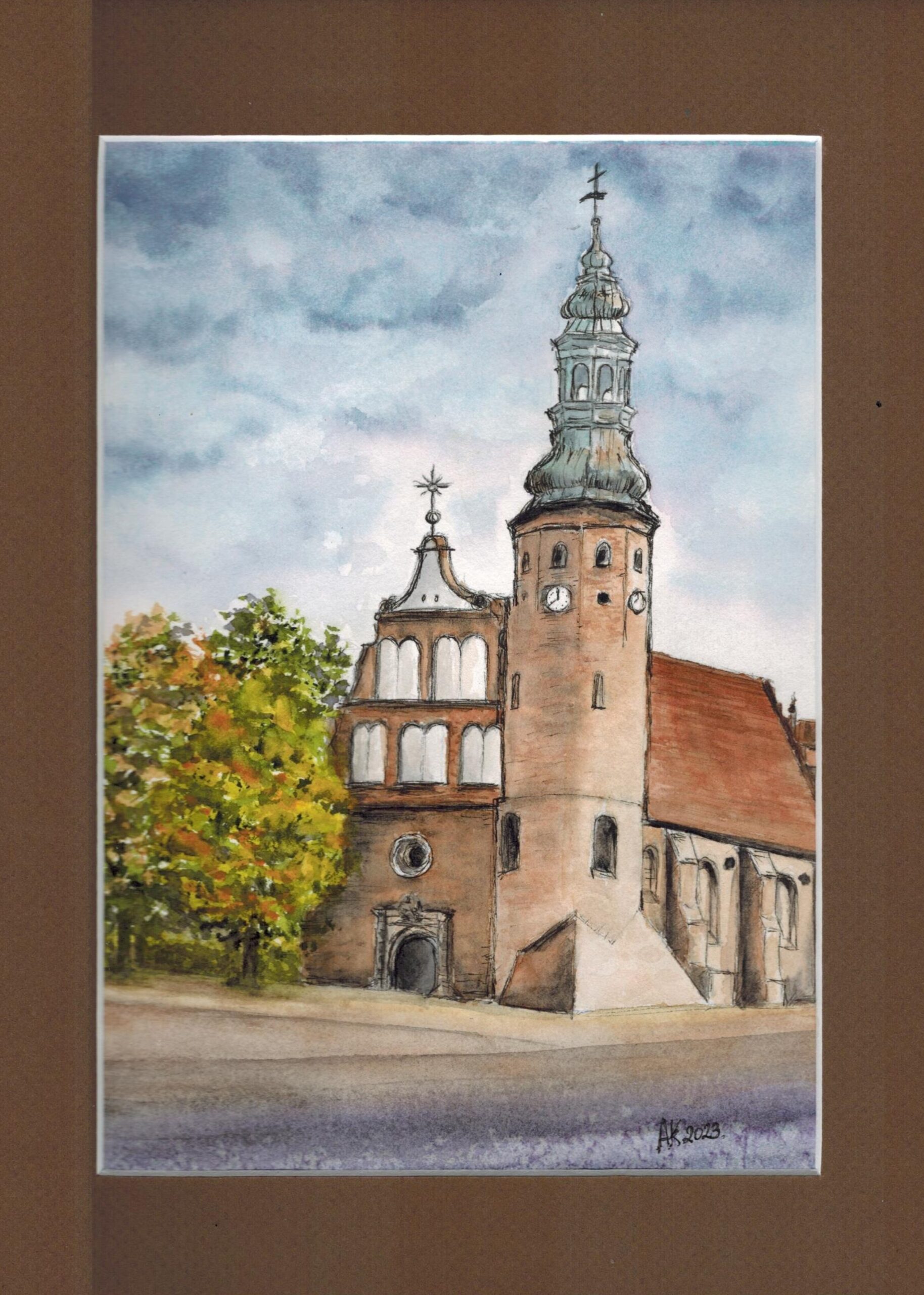 Subtelna akwarela ukazująca kościół Klarysek w Bydgoszczy. Malowana z wyczuciem i spokojem, oddaje ciepło światła i charakter miejsca.